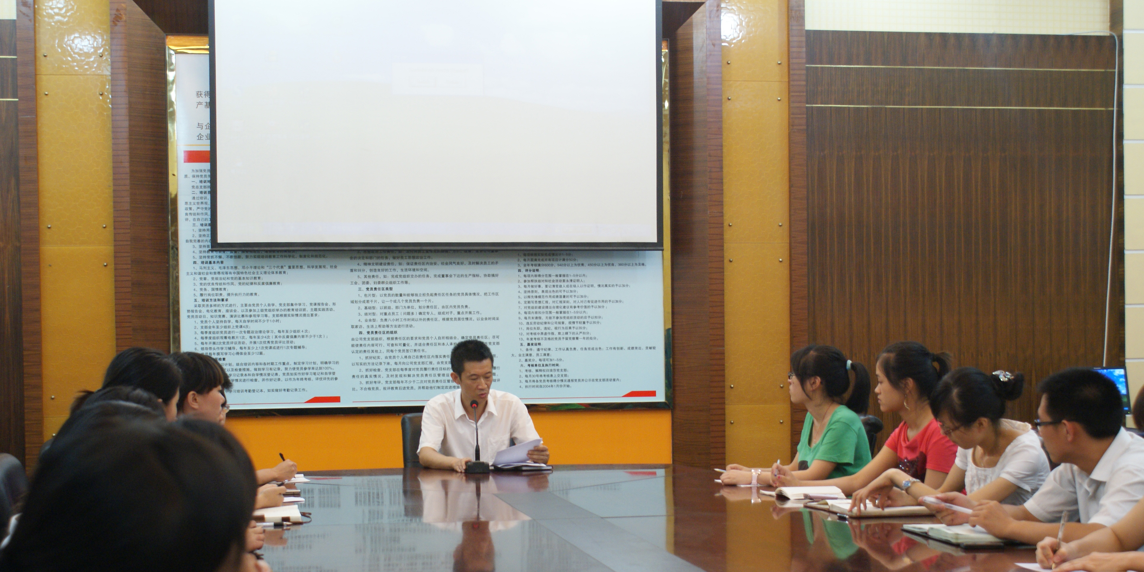 江主任首先带领大家观看了一段9分钟的接待手势礼仪视频,手势分为45度点臂式小请(请进)、斜指式中请(请坐)、直臂式大请(指示方向)和左右双臂式多情(请全场入座)。紧接着,大家共同学习了接待准备的10个要点。就参观路线,江主任也为大家列出标准参观路线,目的是让访客在最短的时间内对公司的企业文化、生产状况有一个初步的了解。要求接待人员根据参观路线的需要,提前通知该线路的相关负责人准备好接待。